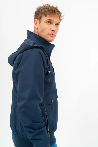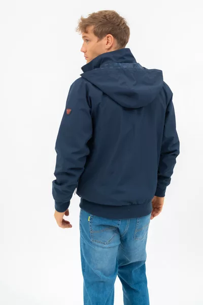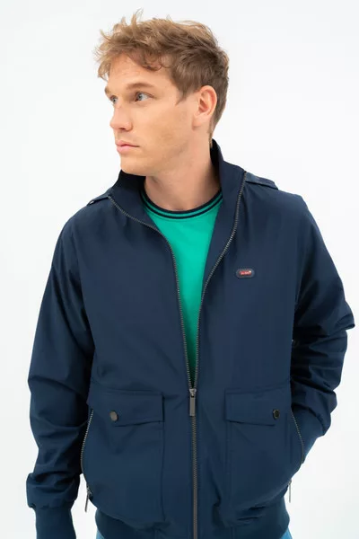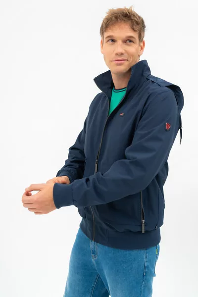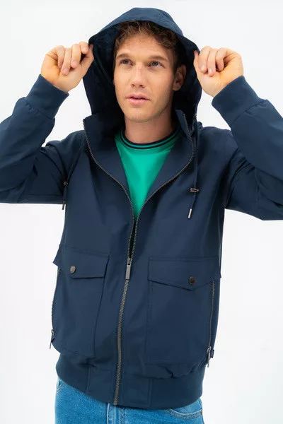 Férfi dzseki . Kapucni a gallérban. Belső zsebek. Fémcímkével díszítve.